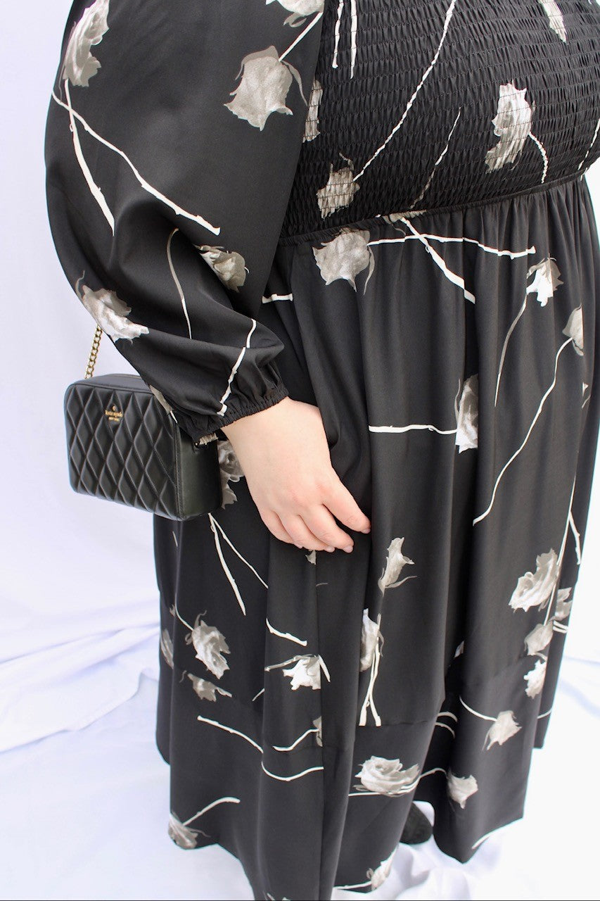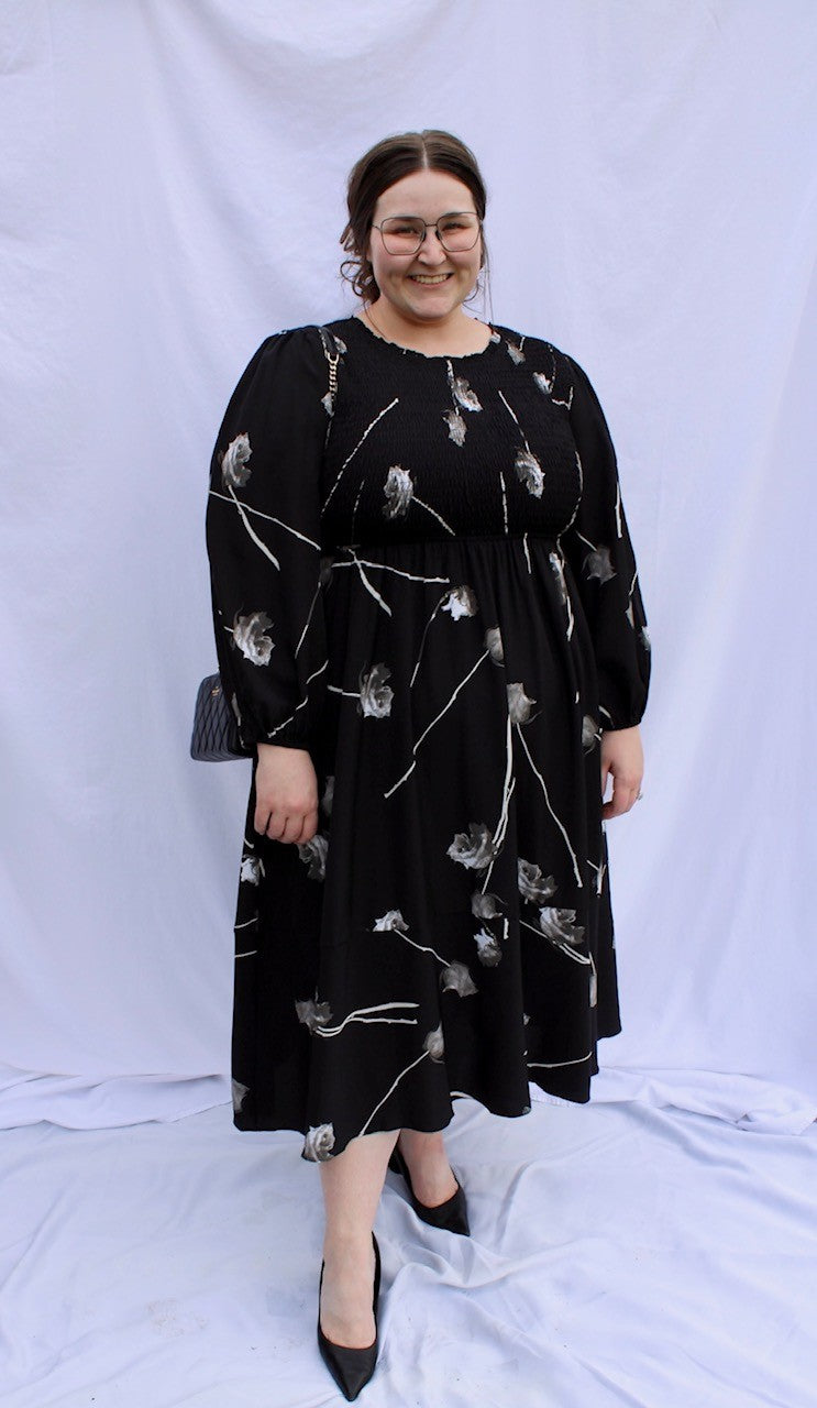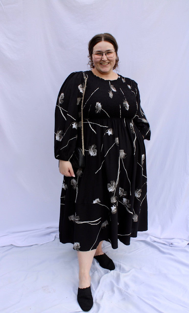 This dreamy black midi dress is effortlessly elegant with its flowy silhouette and soft floral print. The smocked bodice adds a touch of texture and shape, while the billowy sleeve bring in that perfect hint of romance. Paired with a subtle gold chain bag and cozy flats, it's giving cottage core meets city chic- timeless, comfy, and charming all at once.